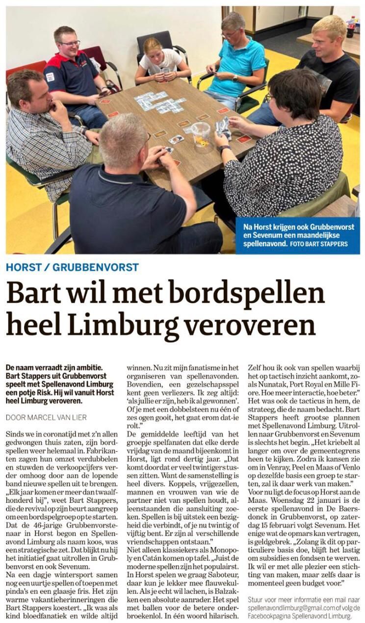 Initiatiefnemer Bart Stappers is bereikbaar via spellenavond@norbertuswijk.nl of het mailadres in bovenstaand krantenartikel.
